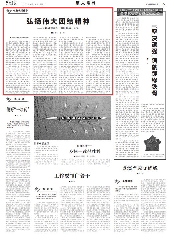 用目標和行動贏得團結。習主席指出,“圍繞明確奮斗目標形成的團結才是最牢固的團結”。抗日戰爭時期,我們黨高舉抗日民族統一戰線的旗幟,堅決維護、鞏固、發展統一戰線,堅持獨立自主、團結抗戰。配合正面戰場,我軍官兵以同敵人血戰到底的英勇氣概,取得了平型關大捷、雁門關伏擊戰大捷、陽明堡大捷等勝利,鼓舞了全民族團結抗戰的士氣;發動百團大戰,沖破日本侵略者的“囚籠政策”,捍衛了抗日根據地,扭轉了抗戰局面;堅持游擊戰爭的戰略戰術,采用破襲戰、地道戰、地雷戰、麻雀戰等靈活戰法,抗擊日偽軍的“掃蕩”“清鄉”“蠶食”,用英勇頑強的斗爭贏得全國人民的高度信賴,增強了全民族團結抗戰的信心。歷史證明,我們黨堅持以最明確的目標和最有力的行動,贏得民心、凝聚力量。作為新時代革命軍人,我們弘揚偉大團結精神,就要響應黨的號召,積極投身實現建軍一百年奮斗目標的偉大實踐,在各自崗位上當好“中國式現代化建設的堅定行動派、實干家”,用實干苦干加巧干,用跨越更多“雪山”“草地”、征服更多“婁山關”“臘子口”的實際行動,在一步步推進偉大目標實現的過程中,不斷增強凝聚力和戰斗力。
