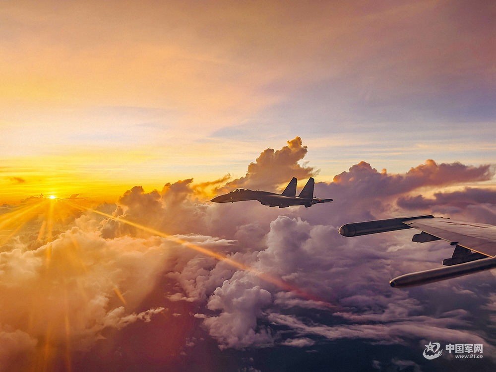 【每天一張新壁紙 “換”醒戰斗力】空軍某部開展夜間飛行訓練,圖為戰機編隊迎著晨光飛行。(攝影:李承燊 海報:孫悅)