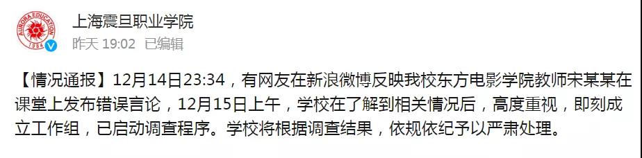 12月15日19點左右,上海震旦職業學院官方回應表示,有網友反映我校東方電影學院教師宋某某在課堂上發布錯誤言論,12月15日上午,學校在了解到相關情況后,高度重視,即刻成立工作組,已啟動調查程序。學校將根據調查結果,依規依紀予以嚴肅處理。